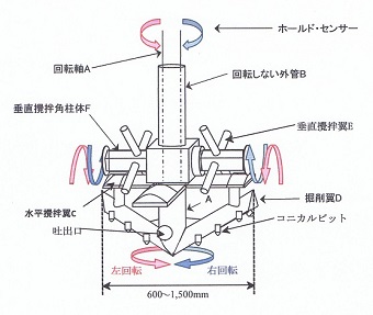@掘削回転軸Aが正回転(右回転)する場合、水平攪拌翼も同様にAと同方向に回転する。